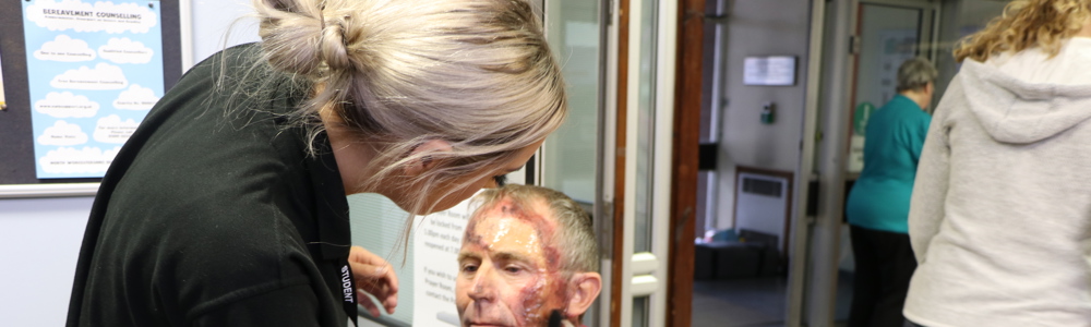Earlier this month, Heart of Worcestershire College’s (HoW College) Level 3 Theatrical and Media Make-up students attended a training event ‘Autumn Leaves’ for the emergency services at Kidderminster hospital and to practice their special effects make-up.